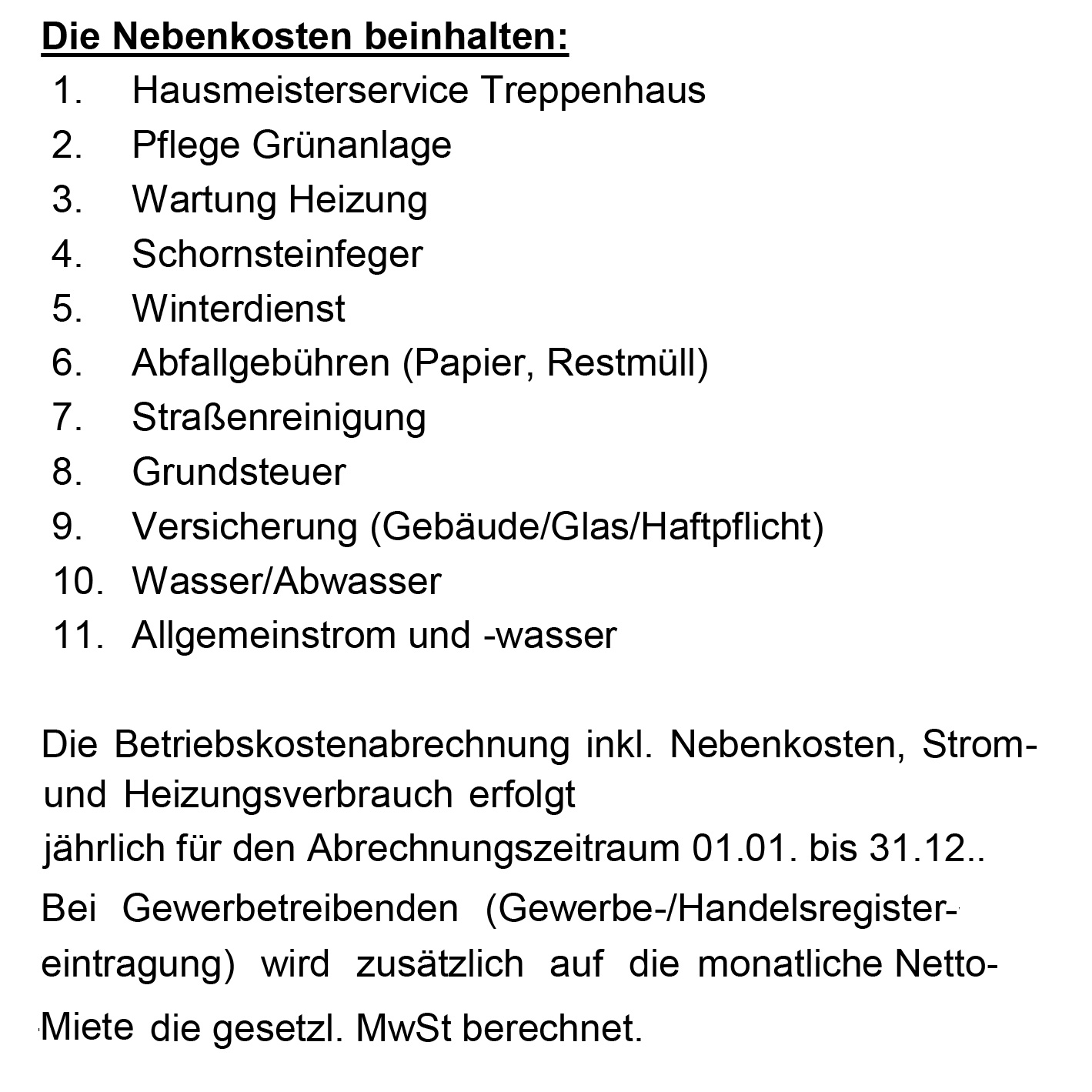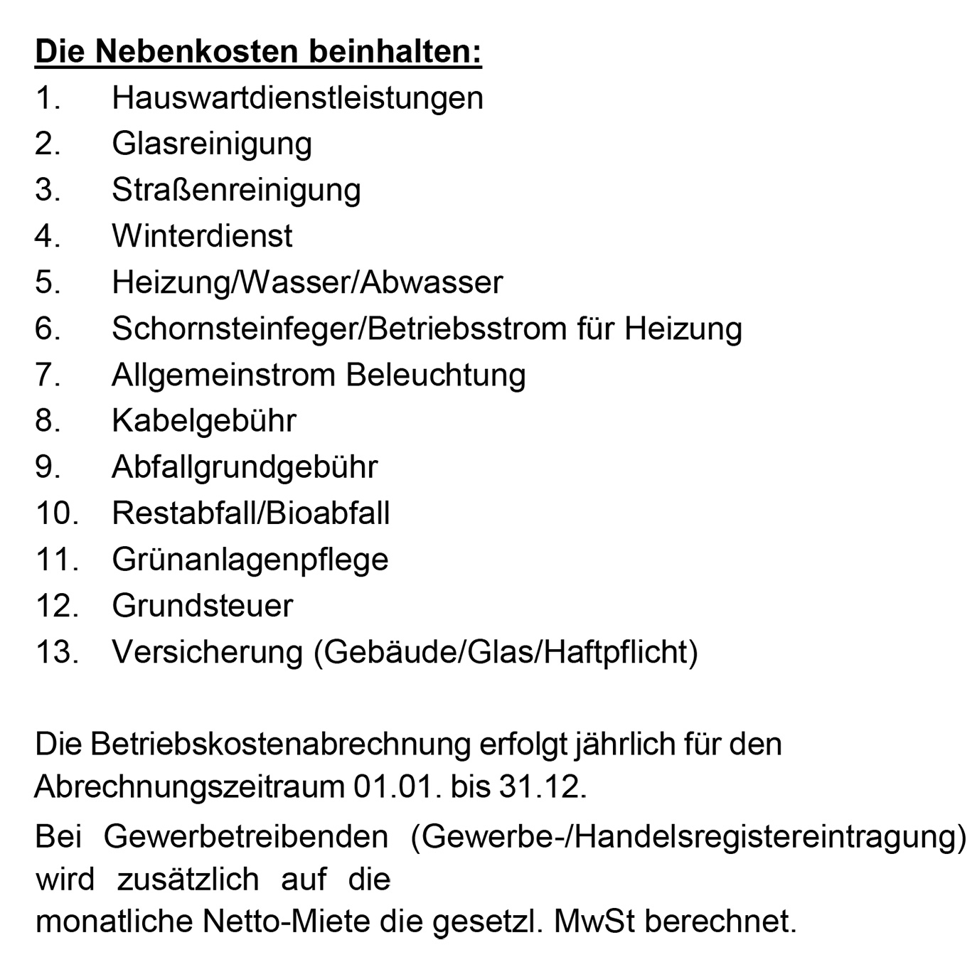 Nebenkosten 2,00 EUR/m² netto oder pauschal 220,00 EUR netto